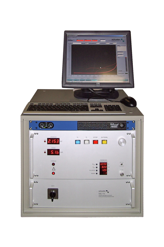 Das Messgerät KML 710 dient zur Prüfung der Sperrkennlinie von Leistungshalbleitern. Dabei werden Spitzenspannungen bis zu 15 kV bei Strömen bis zu 200 mA zur Verfügung gestellt.